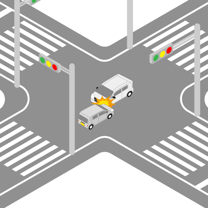 ・イラストに使用している各要素(車、背景、車、天候、信号、衝突地点など)は、代表的なイメージをイラスト化しており、色や形状等含め現実の事故の状況とは異なります。あくまで、事故のイメージとして参考までにご活用ください。