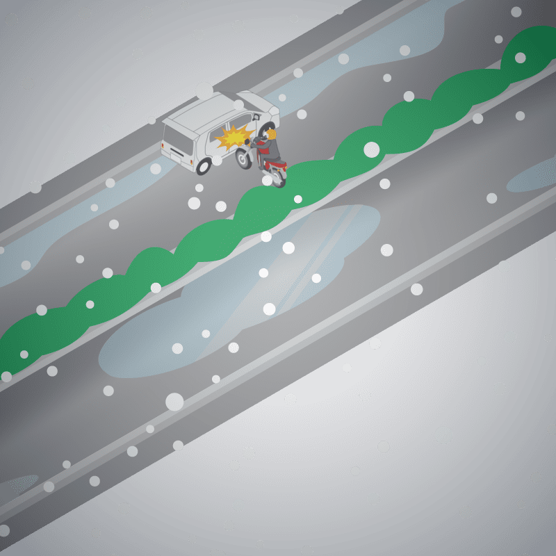 ・イラストに使用している各要素(車、背景、車、天候、信号、衝突地点など)は、代表的なイメージをイラスト化しており、色や形状等含め現実の事故の状況とは異なります。あくまで、事故のイメージとして参考までにご活用ください。