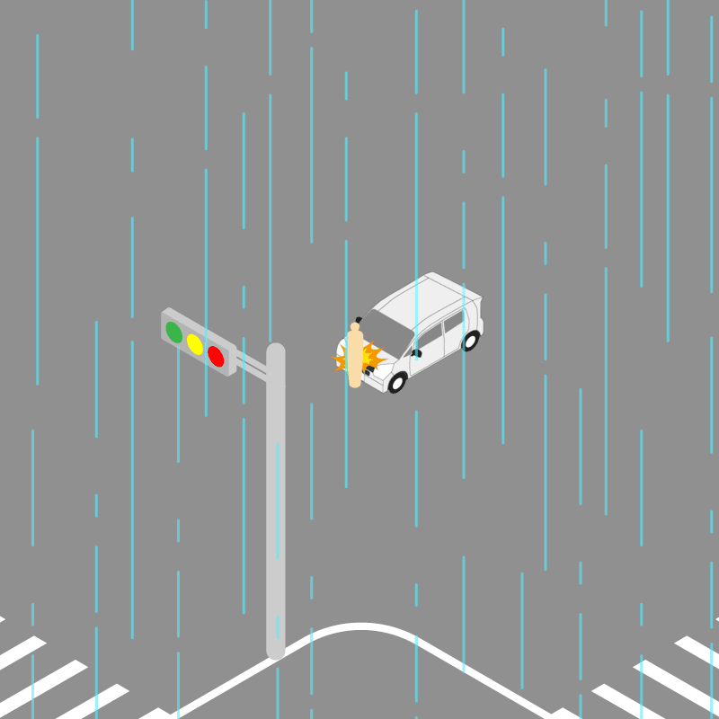・イラストに使用している各要素(車、背景、車、天候、信号、衝突地点など)は、代表的なイメージをイラスト化しており、色や形状等含め現実の事故の状況とは異なります。あくまで、事故のイメージとして参考までにご活用ください。