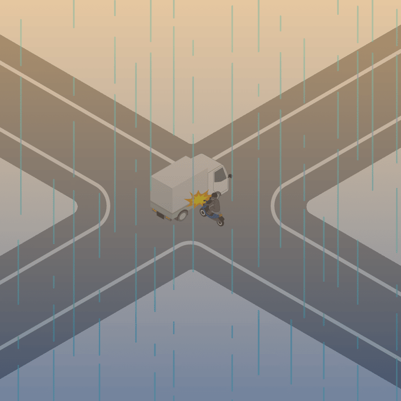・イラストに使用している各要素(車、背景、車、天候、信号、衝突地点など)は、代表的なイメージをイラスト化しており、色や形状等含め現実の事故の状況とは異なります。あくまで、事故のイメージとして参考までにご活用ください。