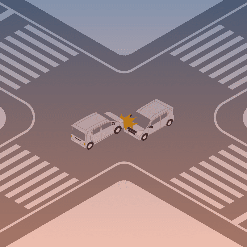 ・イラストに使用している各要素(車、背景、車、天候、信号、衝突地点など)は、代表的なイメージをイラスト化しており、色や形状等含め現実の事故の状況とは異なります。あくまで、事故のイメージとして参考までにご活用ください。