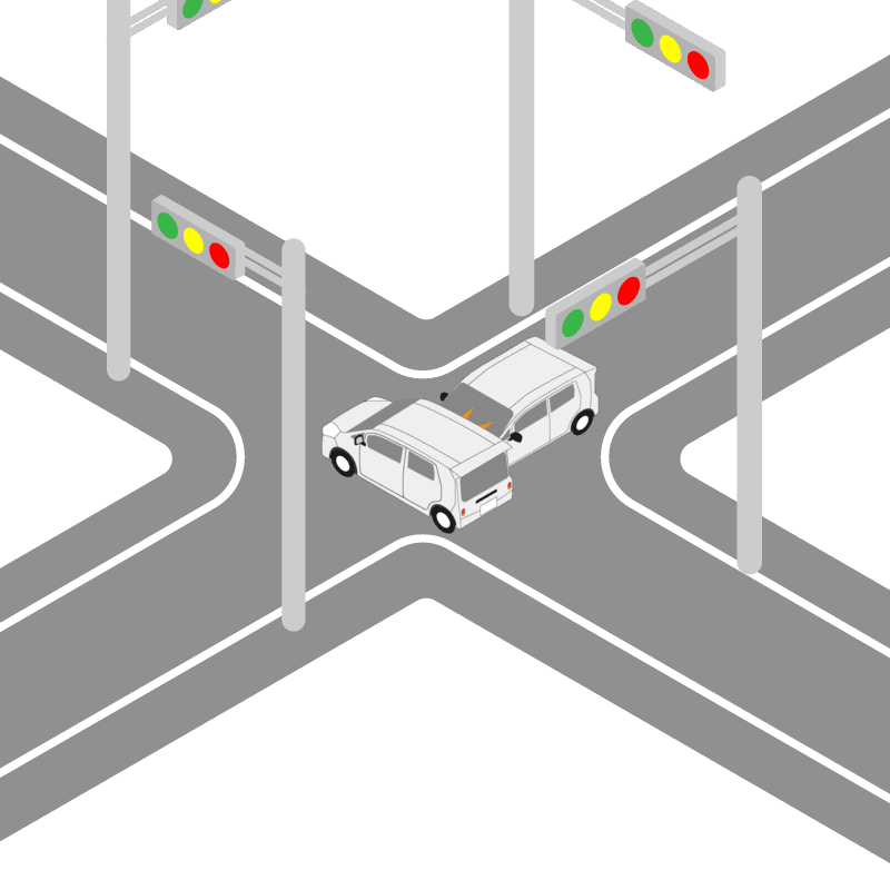 ・イラストに使用している各要素(車、背景、車、天候、信号、衝突地点など)は、代表的なイメージをイラスト化しており、色や形状等含め現実の事故の状況とは異なります。あくまで、事故のイメージとして参考までにご活用ください。