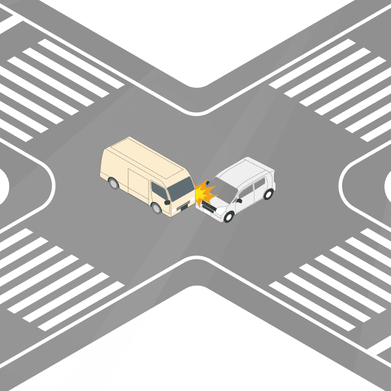 ・イラストに使用している各要素(車、背景、車、天候、信号、衝突地点など)は、代表的なイメージをイラスト化しており、色や形状等含め現実の事故の状況とは異なります。あくまで、事故のイメージとして参考までにご活用ください。