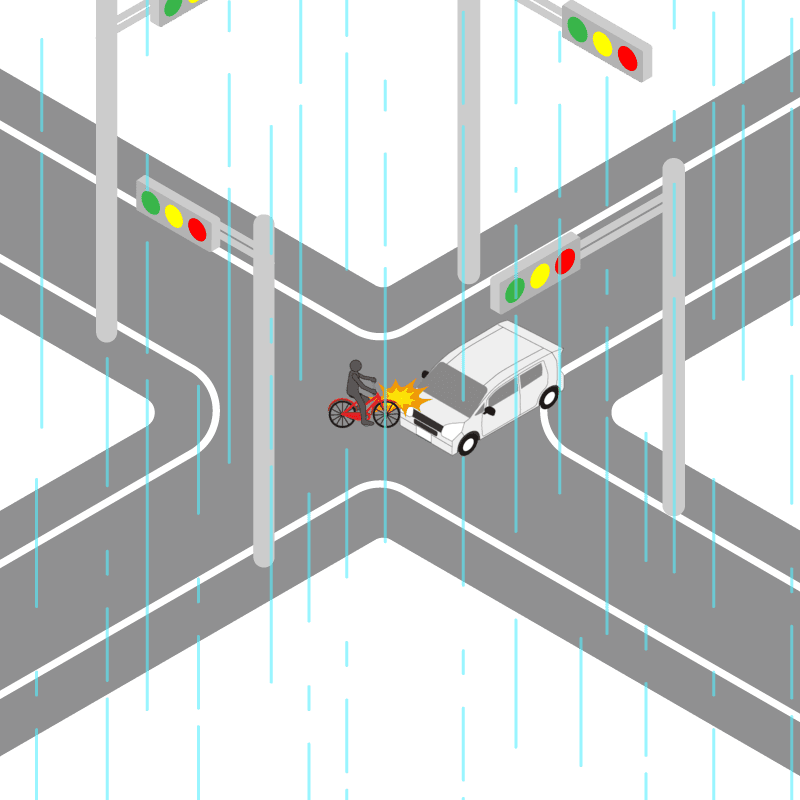 ・イラストに使用している各要素(車、背景、車、天候、信号、衝突地点など)は、代表的なイメージをイラスト化しており、色や形状等含め現実の事故の状況とは異なります。あくまで、事故のイメージとして参考までにご活用ください。