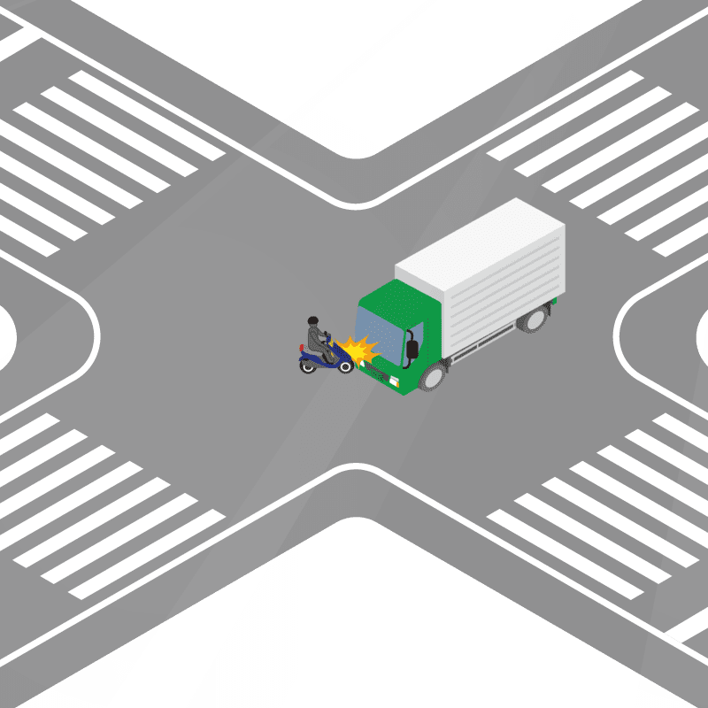 ・イラストに使用している各要素(車、背景、車、天候、信号、衝突地点など)は、代表的なイメージをイラスト化しており、色や形状等含め現実の事故の状況とは異なります。あくまで、事故のイメージとして参考までにご活用ください。