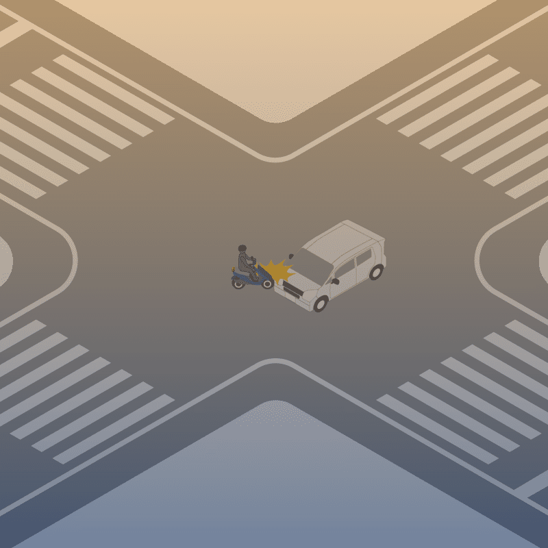 ・イラストに使用している各要素(車、背景、車、天候、信号、衝突地点など)は、代表的なイメージをイラスト化しており、色や形状等含め現実の事故の状況とは異なります。あくまで、事故のイメージとして参考までにご活用ください。
