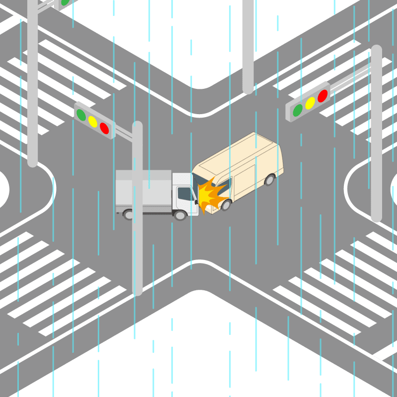 ・イラストに使用している各要素(車、背景、車、天候、信号、衝突地点など)は、代表的なイメージをイラスト化しており、色や形状等含め現実の事故の状況とは異なります。あくまで、事故のイメージとして参考までにご活用ください。