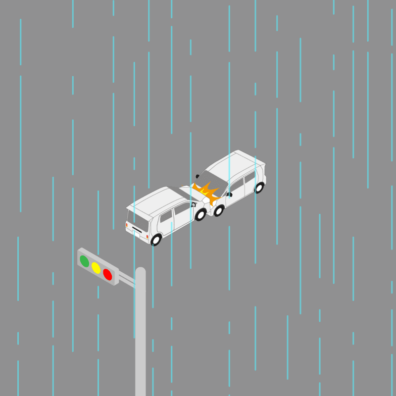 ・イラストに使用している各要素(車、背景、車、天候、信号、衝突地点など)は、代表的なイメージをイラスト化しており、色や形状等含め現実の事故の状況とは異なります。あくまで、事故のイメージとして参考までにご活用ください。