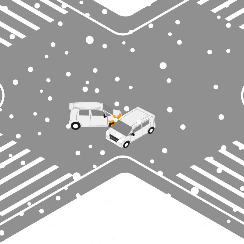 ・イラストに使用している各要素(車、背景、車、天候、信号、衝突地点など)は、代表的なイメージをイラスト化しており、色や形状等含め現実の事故の状況とは異なります。あくまで、事故のイメージとして参考までにご活用ください。