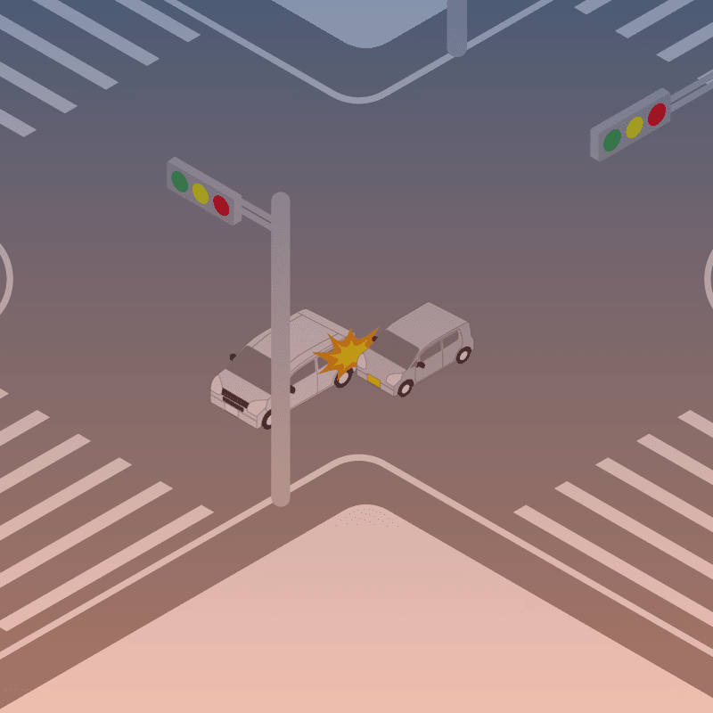 ・イラストに使用している各要素(車、背景、車、天候、信号、衝突地点など)は、代表的なイメージをイラスト化しており、色や形状等含め現実の事故の状況とは異なります。あくまで、事故のイメージとして参考までにご活用ください。