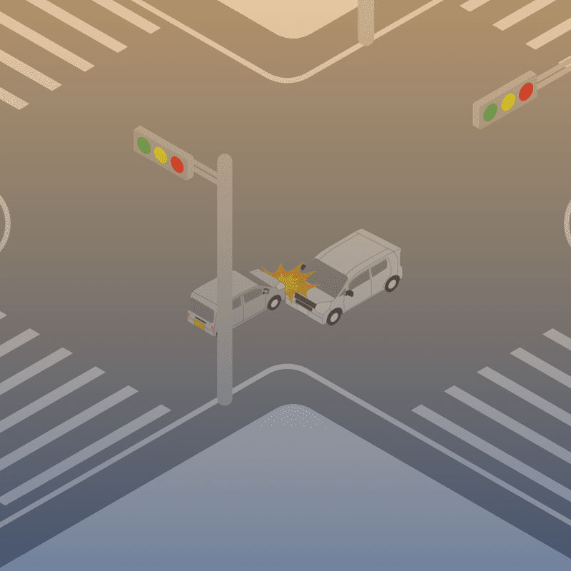 ・イラストに使用している各要素(車、背景、車、天候、信号、衝突地点など)は、代表的なイメージをイラスト化しており、色や形状等含め現実の事故の状況とは異なります。あくまで、事故のイメージとして参考までにご活用ください。
