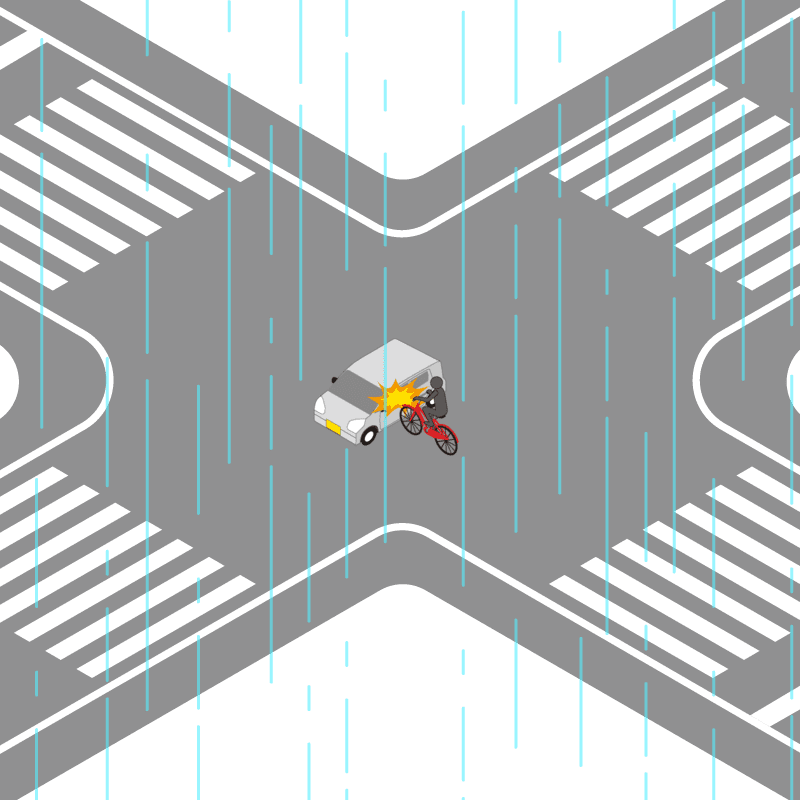 ・イラストに使用している各要素(車、背景、車、天候、信号、衝突地点など)は、代表的なイメージをイラスト化しており、色や形状等含め現実の事故の状況とは異なります。あくまで、事故のイメージとして参考までにご活用ください。