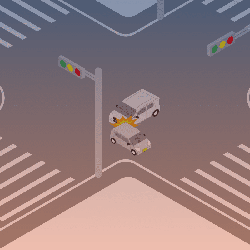 ・イラストに使用している各要素(車、背景、車、天候、信号、衝突地点など)は、代表的なイメージをイラスト化しており、色や形状等含め現実の事故の状況とは異なります。あくまで、事故のイメージとして参考までにご活用ください。