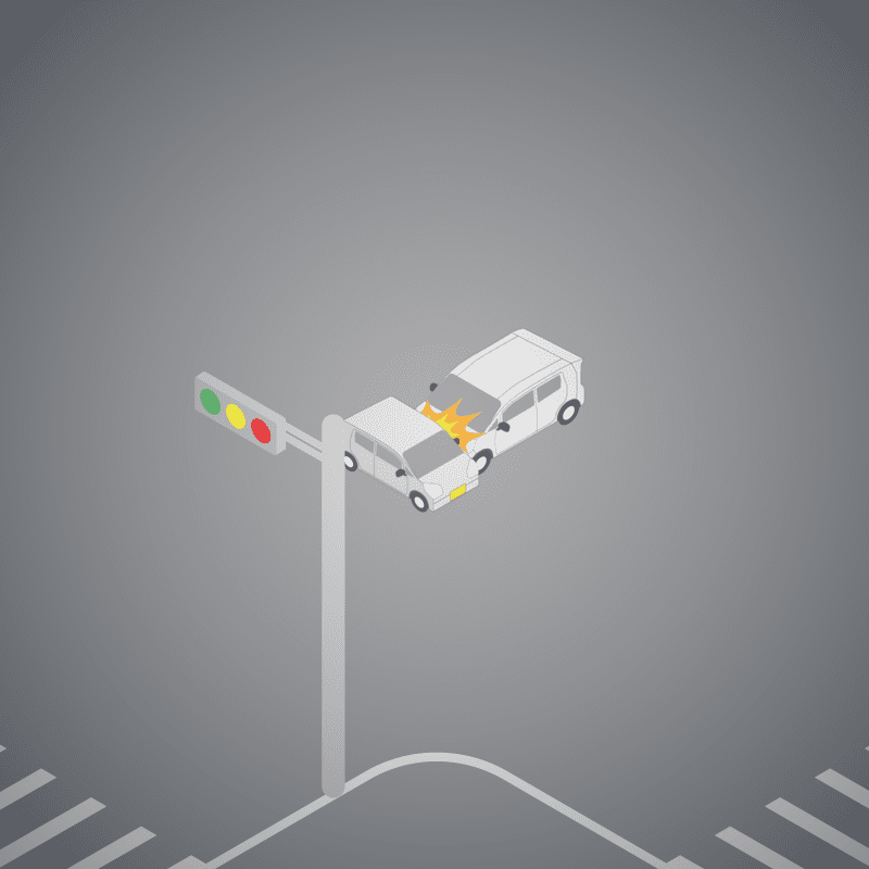 ・イラストに使用している各要素(車、背景、車、天候、信号、衝突地点など)は、代表的なイメージをイラスト化しており、色や形状等含め現実の事故の状況とは異なります。あくまで、事故のイメージとして参考までにご活用ください。