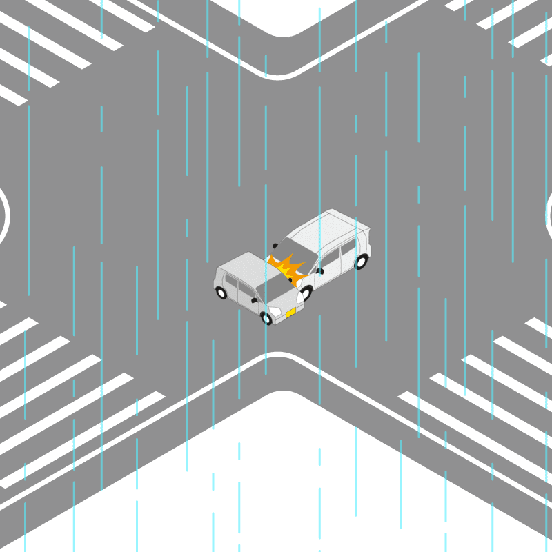 ・イラストに使用している各要素(車、背景、車、天候、信号、衝突地点など)は、代表的なイメージをイラスト化しており、色や形状等含め現実の事故の状況とは異なります。あくまで、事故のイメージとして参考までにご活用ください。