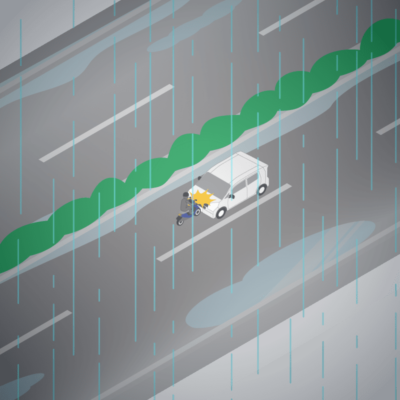・イラストに使用している各要素(車、背景、車、天候、信号、衝突地点など)は、代表的なイメージをイラスト化しており、色や形状等含め現実の事故の状況とは異なります。あくまで、事故のイメージとして参考までにご活用ください。