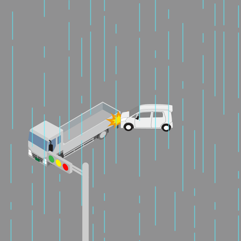 ・イラストに使用している各要素(車、背景、車、天候、信号、衝突地点など)は、代表的なイメージをイラスト化しており、色や形状等含め現実の事故の状況とは異なります。あくまで、事故のイメージとして参考までにご活用ください。