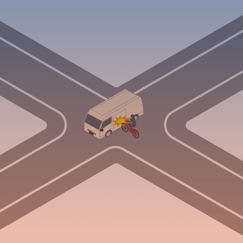 ・イラストに使用している各要素(車、背景、車、天候、信号、衝突地点など)は、代表的なイメージをイラスト化しており、色や形状等含め現実の事故の状況とは異なります。あくまで、事故のイメージとして参考までにご活用ください。