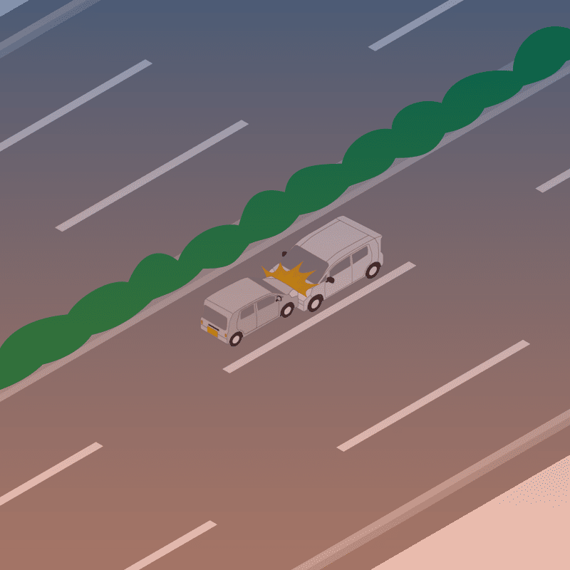 ・イラストに使用している各要素(車、背景、車、天候、信号、衝突地点など)は、代表的なイメージをイラスト化しており、色や形状等含め現実の事故の状況とは異なります。あくまで、事故のイメージとして参考までにご活用ください。