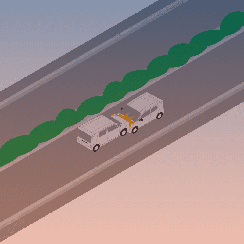 ・イラストに使用している各要素(車、背景、車、天候、信号、衝突地点など)は、代表的なイメージをイラスト化しており、色や形状等含め現実の事故の状況とは異なります。あくまで、事故のイメージとして参考までにご活用ください。