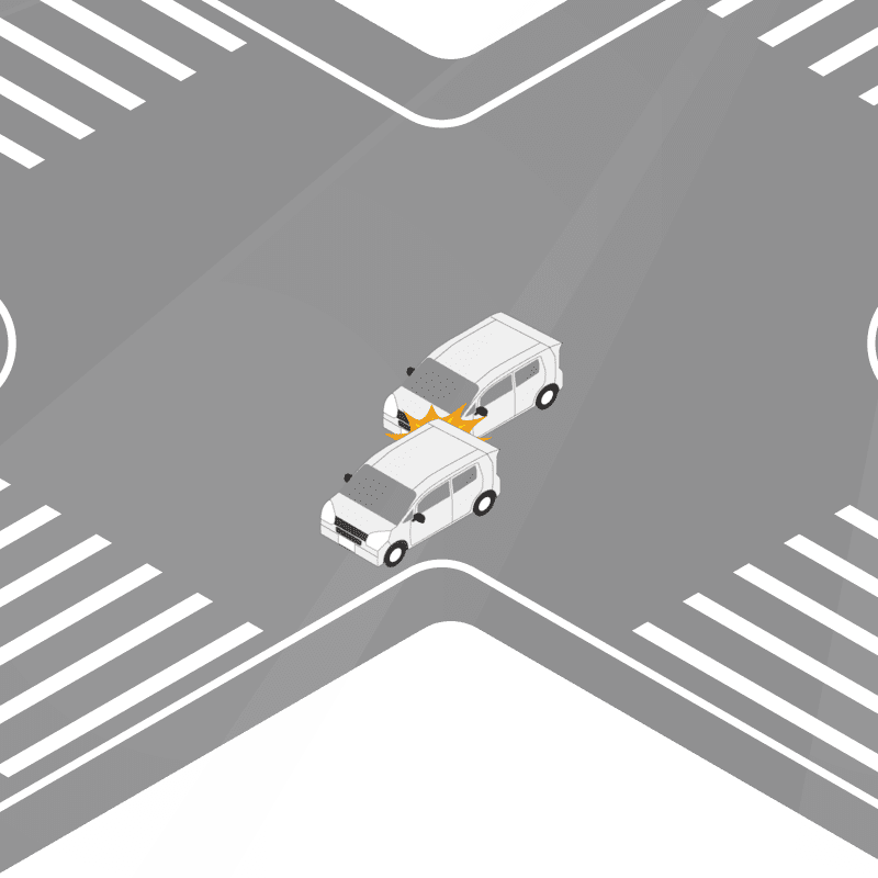 ・イラストに使用している各要素(車、背景、車、天候、信号、衝突地点など)は、代表的なイメージをイラスト化しており、色や形状等含め現実の事故の状況とは異なります。あくまで、事故のイメージとして参考までにご活用ください。