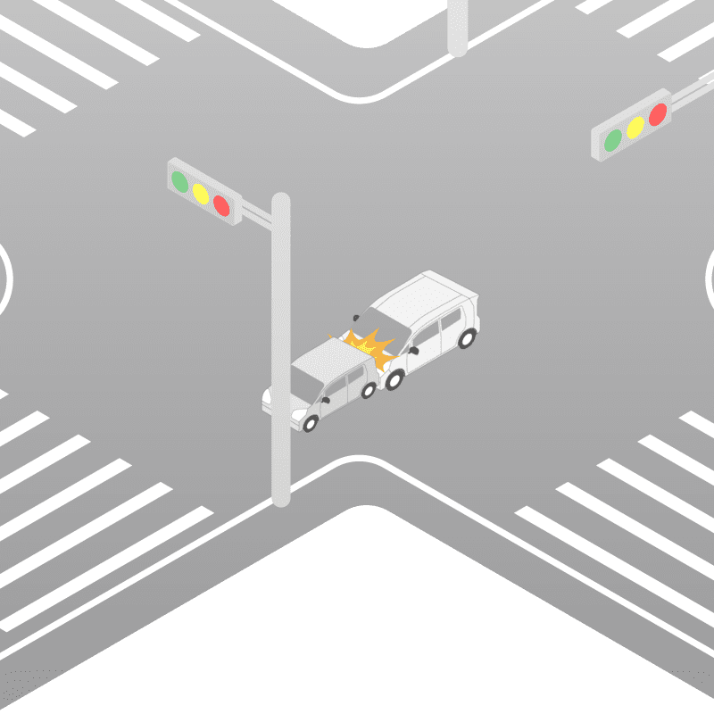 ・イラストに使用している各要素(車、背景、車、天候、信号、衝突地点など)は、代表的なイメージをイラスト化しており、色や形状等含め現実の事故の状況とは異なります。あくまで、事故のイメージとして参考までにご活用ください。