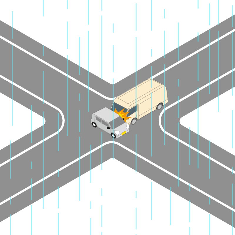 ・イラストに使用している各要素(車、背景、車、天候、信号、衝突地点など)は、代表的なイメージをイラスト化しており、色や形状等含め現実の事故の状況とは異なります。あくまで、事故のイメージとして参考までにご活用ください。
