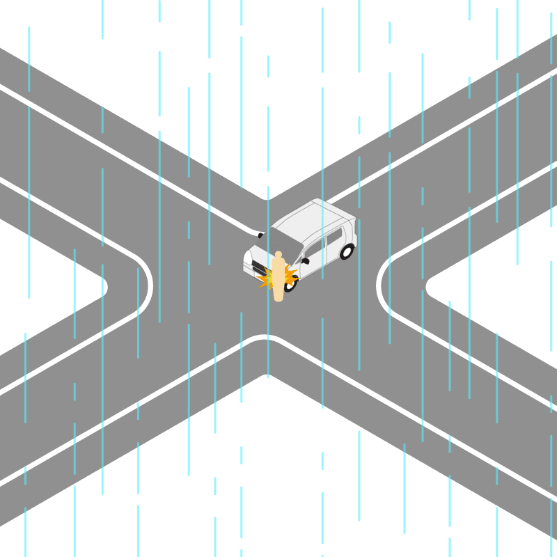 ・イラストに使用している各要素(車、背景、車、天候、信号、衝突地点など)は、代表的なイメージをイラスト化しており、色や形状等含め現実の事故の状況とは異なります。あくまで、事故のイメージとして参考までにご活用ください。