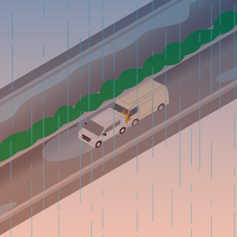 ・イラストに使用している各要素(車、背景、車、天候、信号、衝突地点など)は、代表的なイメージをイラスト化しており、色や形状等含め現実の事故の状況とは異なります。あくまで、事故のイメージとして参考までにご活用ください。