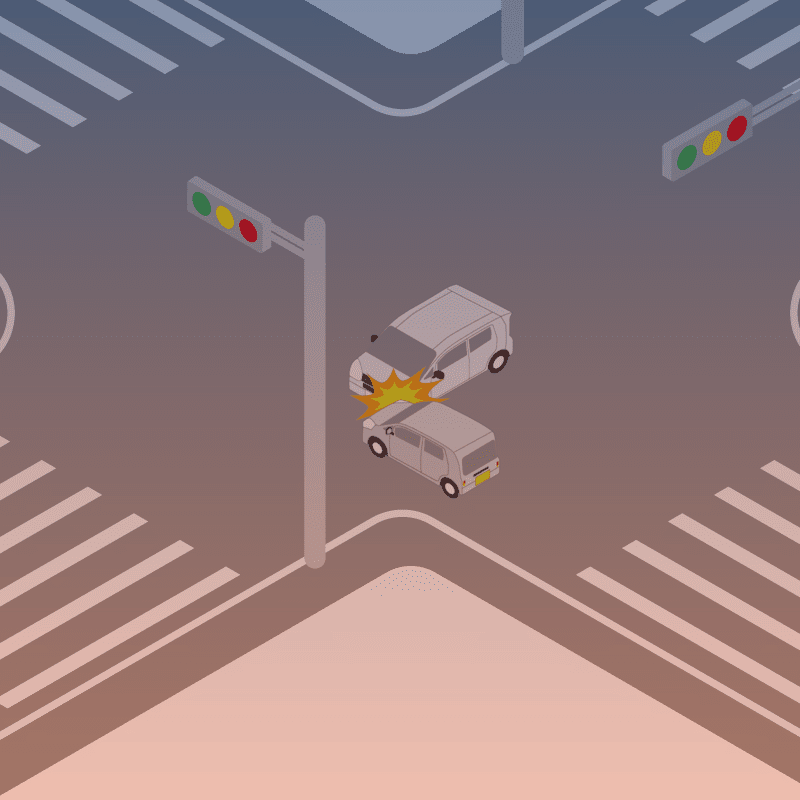 ・イラストに使用している各要素(車、背景、車、天候、信号、衝突地点など)は、代表的なイメージをイラスト化しており、色や形状等含め現実の事故の状況とは異なります。あくまで、事故のイメージとして参考までにご活用ください。