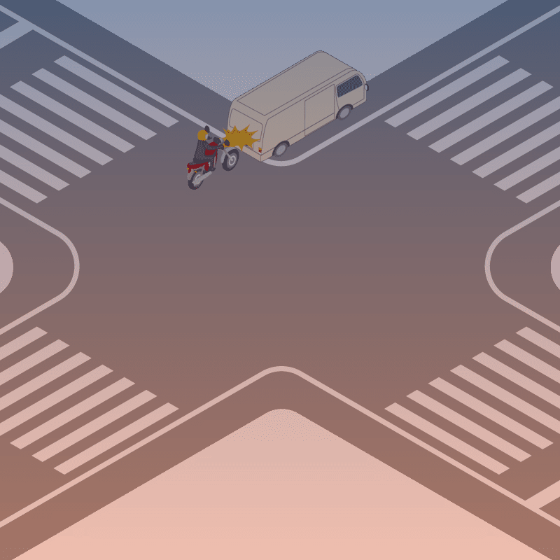・イラストに使用している各要素(車、背景、車、天候、信号、衝突地点など)は、代表的なイメージをイラスト化しており、色や形状等含め現実の事故の状況とは異なります。あくまで、事故のイメージとして参考までにご活用ください。