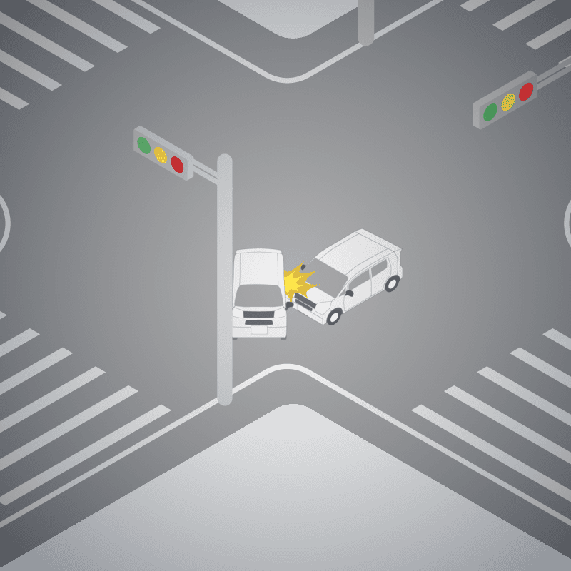 ・イラストに使用している各要素(車、背景、車、天候、信号、衝突地点など)は、代表的なイメージをイラスト化しており、色や形状等含め現実の事故の状況とは異なります。あくまで、事故のイメージとして参考までにご活用ください。