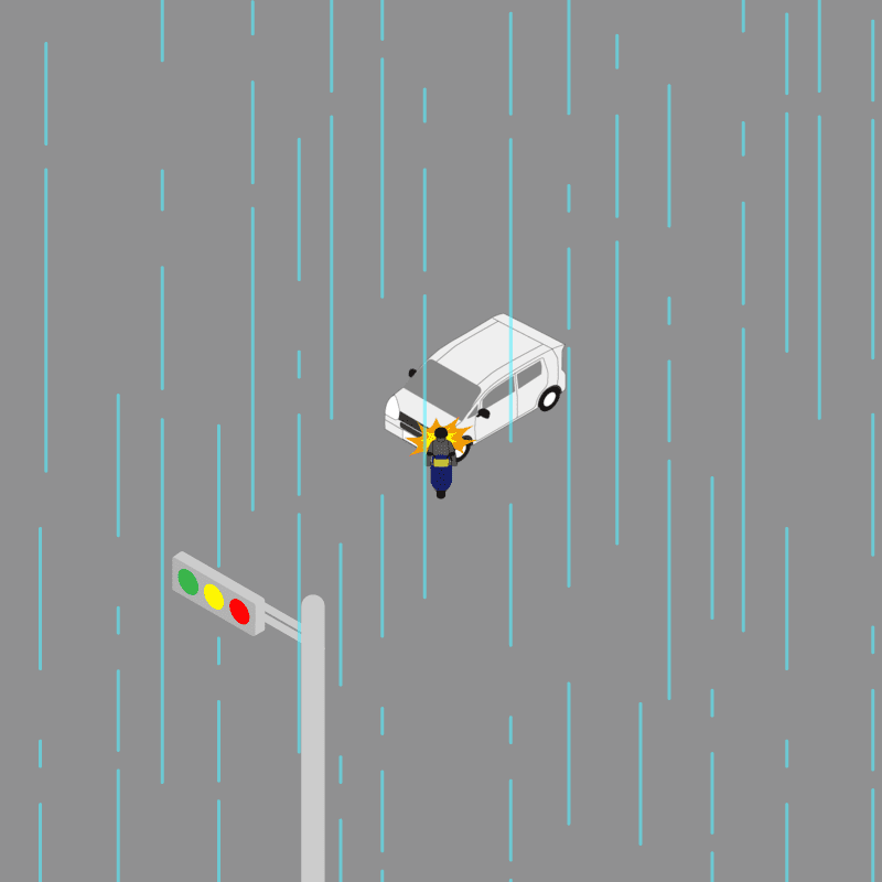・イラストに使用している各要素(車、背景、車、天候、信号、衝突地点など)は、代表的なイメージをイラスト化しており、色や形状等含め現実の事故の状況とは異なります。あくまで、事故のイメージとして参考までにご活用ください。
