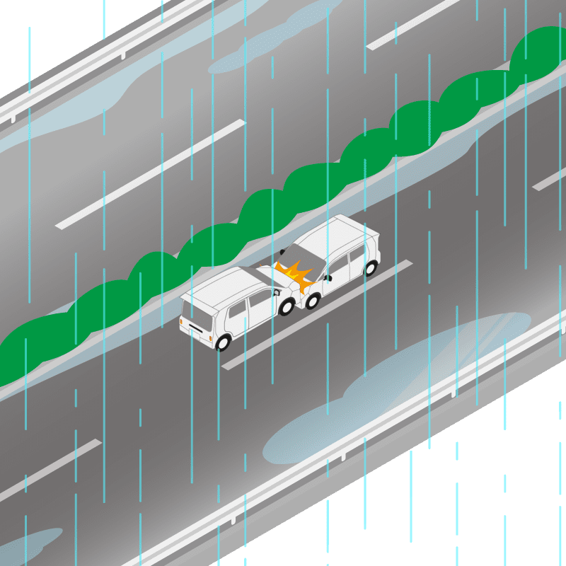 ・イラストに使用している各要素(車、背景、車、天候、信号、衝突地点など)は、代表的なイメージをイラスト化しており、色や形状等含め現実の事故の状況とは異なります。あくまで、事故のイメージとして参考までにご活用ください。