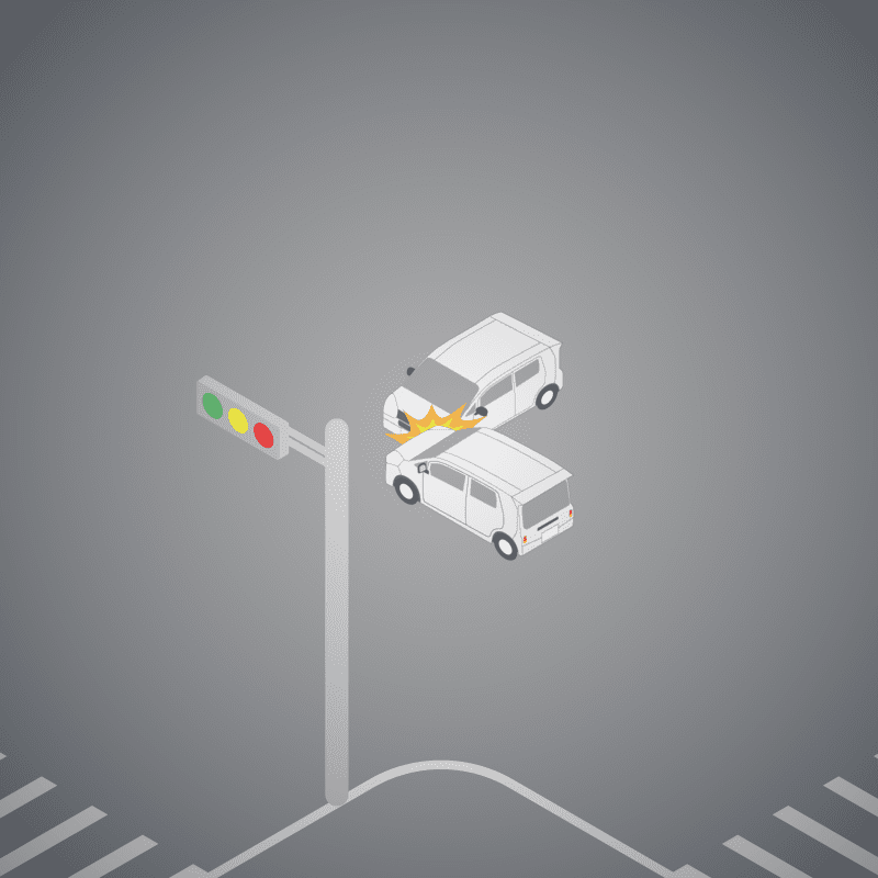 ・イラストに使用している各要素(車、背景、車、天候、信号、衝突地点など)は、代表的なイメージをイラスト化しており、色や形状等含め現実の事故の状況とは異なります。あくまで、事故のイメージとして参考までにご活用ください。