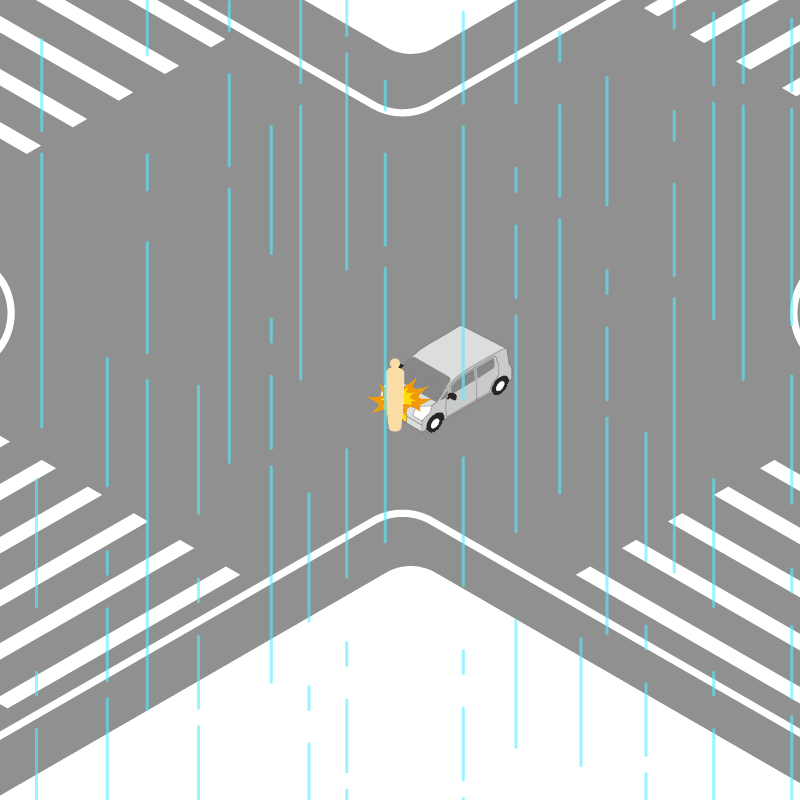・イラストに使用している各要素(車、背景、車、天候、信号、衝突地点など)は、代表的なイメージをイラスト化しており、色や形状等含め現実の事故の状況とは異なります。あくまで、事故のイメージとして参考までにご活用ください。