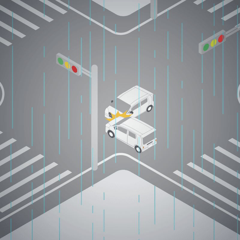 ・イラストに使用している各要素(車、背景、車、天候、信号、衝突地点など)は、代表的なイメージをイラスト化しており、色や形状等含め現実の事故の状況とは異なります。あくまで、事故のイメージとして参考までにご活用ください。