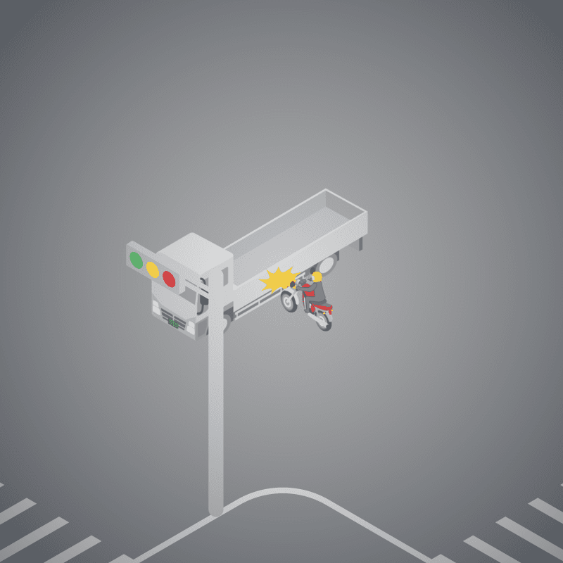 ・イラストに使用している各要素(車、背景、車、天候、信号、衝突地点など)は、代表的なイメージをイラスト化しており、色や形状等含め現実の事故の状況とは異なります。あくまで、事故のイメージとして参考までにご活用ください。