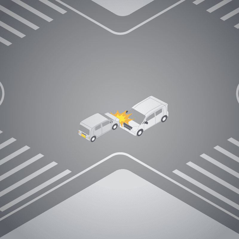 ・イラストに使用している各要素(車、背景、車、天候、信号、衝突地点など)は、代表的なイメージをイラスト化しており、色や形状等含め現実の事故の状況とは異なります。あくまで、事故のイメージとして参考までにご活用ください。