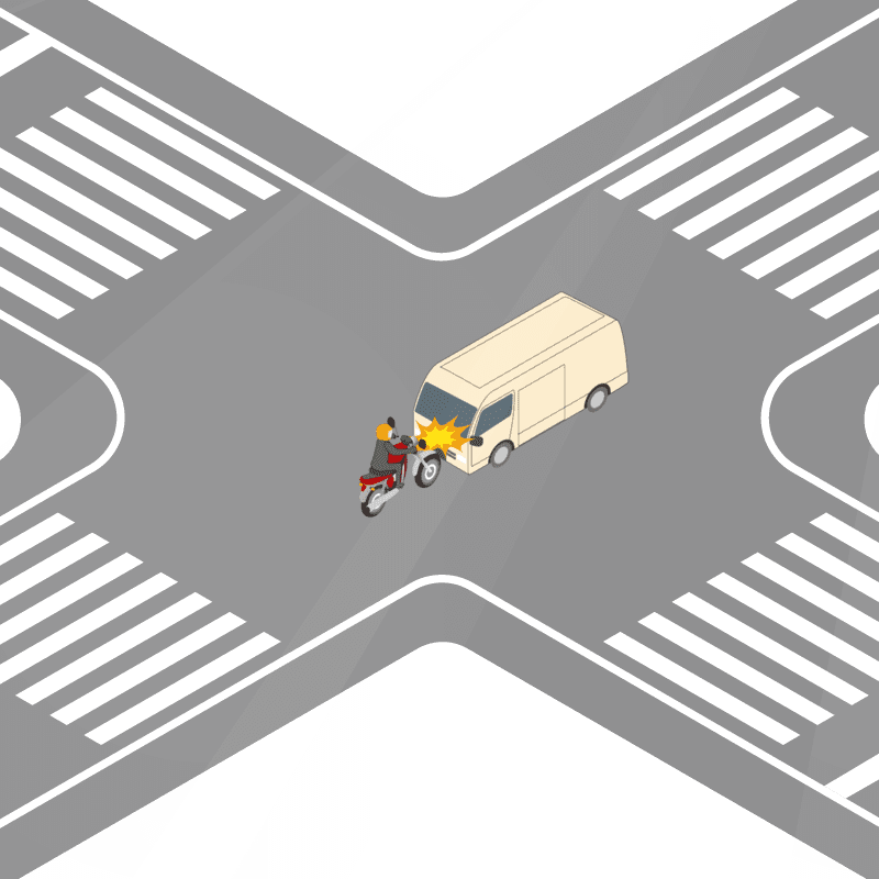 ・イラストに使用している各要素(車、背景、車、天候、信号、衝突地点など)は、代表的なイメージをイラスト化しており、色や形状等含め現実の事故の状況とは異なります。あくまで、事故のイメージとして参考までにご活用ください。