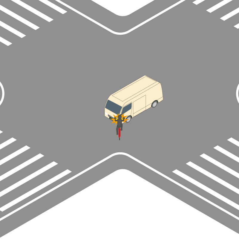・イラストに使用している各要素(車、背景、車、天候、信号、衝突地点など)は、代表的なイメージをイラスト化しており、色や形状等含め現実の事故の状況とは異なります。あくまで、事故のイメージとして参考までにご活用ください。