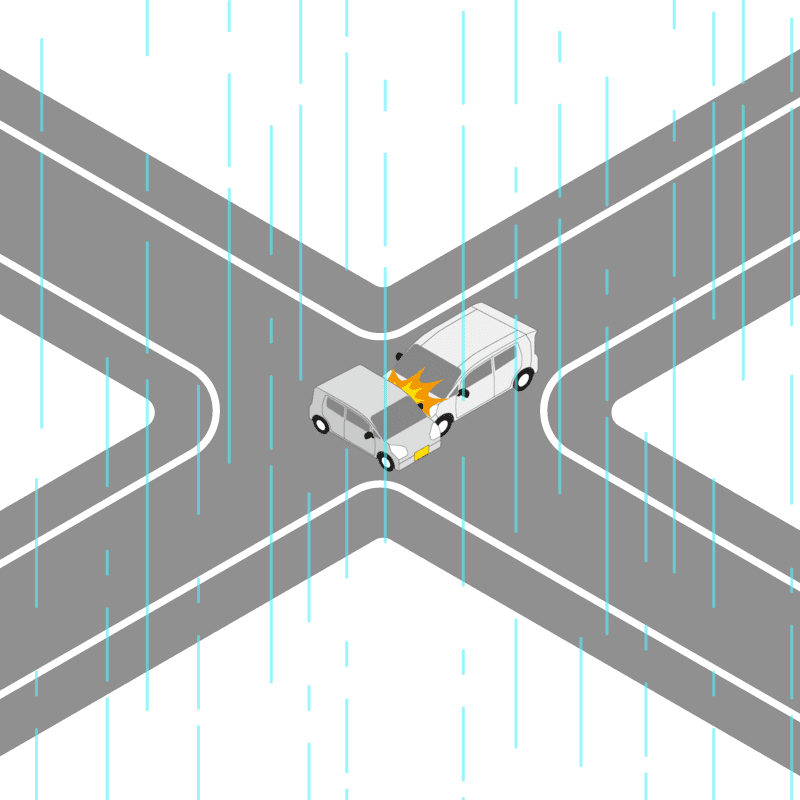 ・イラストに使用している各要素(車、背景、車、天候、信号、衝突地点など)は、代表的なイメージをイラスト化しており、色や形状等含め現実の事故の状況とは異なります。あくまで、事故のイメージとして参考までにご活用ください。