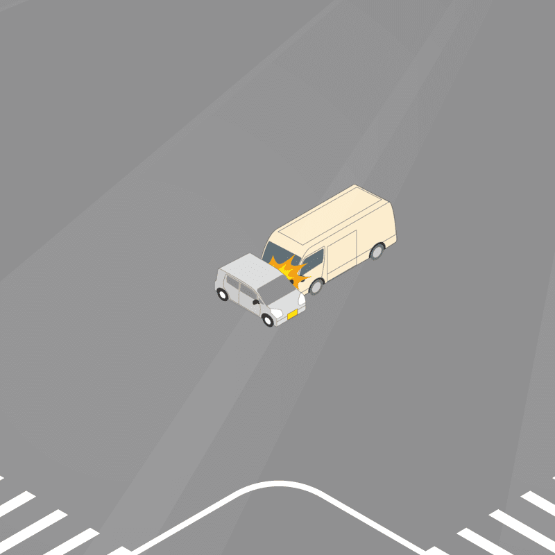 ・イラストに使用している各要素(車、背景、車、天候、信号、衝突地点など)は、代表的なイメージをイラスト化しており、色や形状等含め現実の事故の状況とは異なります。あくまで、事故のイメージとして参考までにご活用ください。