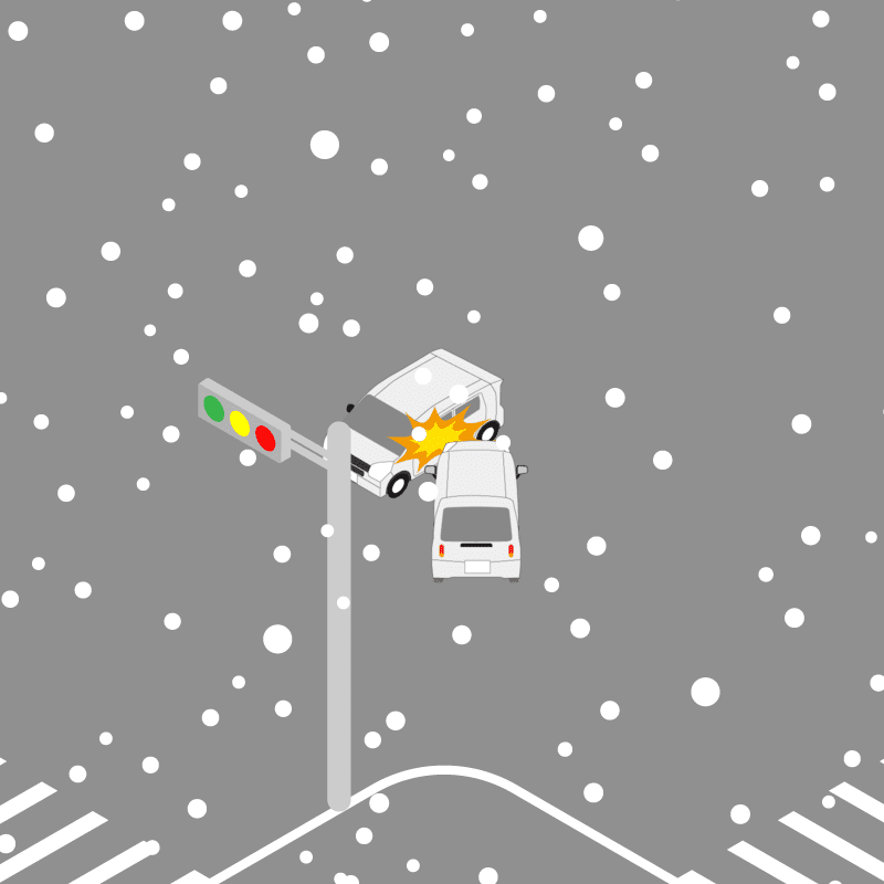 ・イラストに使用している各要素(車、背景、車、天候、信号、衝突地点など)は、代表的なイメージをイラスト化しており、色や形状等含め現実の事故の状況とは異なります。あくまで、事故のイメージとして参考までにご活用ください。