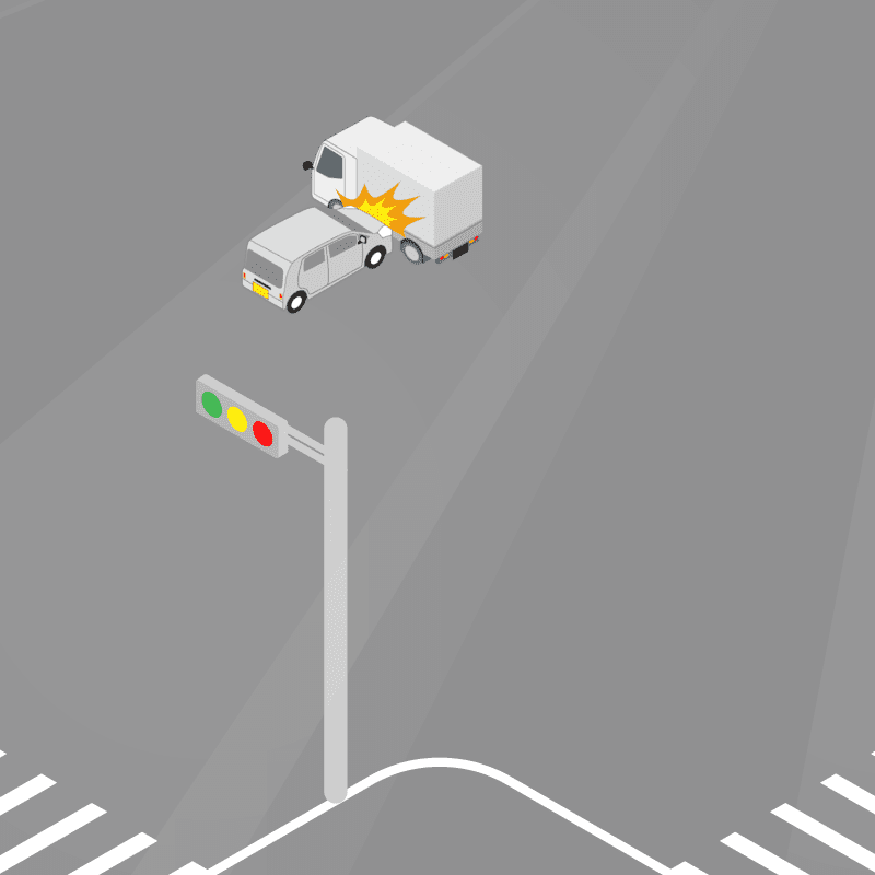 ・イラストに使用している各要素(車、背景、車、天候、信号、衝突地点など)は、代表的なイメージをイラスト化しており、色や形状等含め現実の事故の状況とは異なります。あくまで、事故のイメージとして参考までにご活用ください。