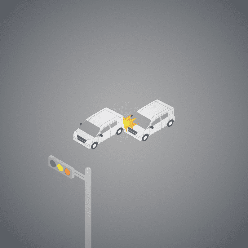 ・イラストに使用している各要素(車、背景、車、天候、信号、衝突地点など)は、代表的なイメージをイラスト化しており、色や形状等含め現実の事故の状況とは異なります。あくまで、事故のイメージとして参考までにご活用ください。