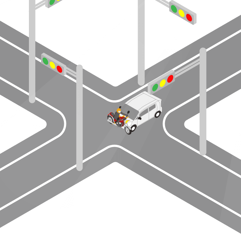 ・イラストに使用している各要素(車、背景、車、天候、信号、衝突地点など)は、代表的なイメージをイラスト化しており、色や形状等含め現実の事故の状況とは異なります。あくまで、事故のイメージとして参考までにご活用ください。