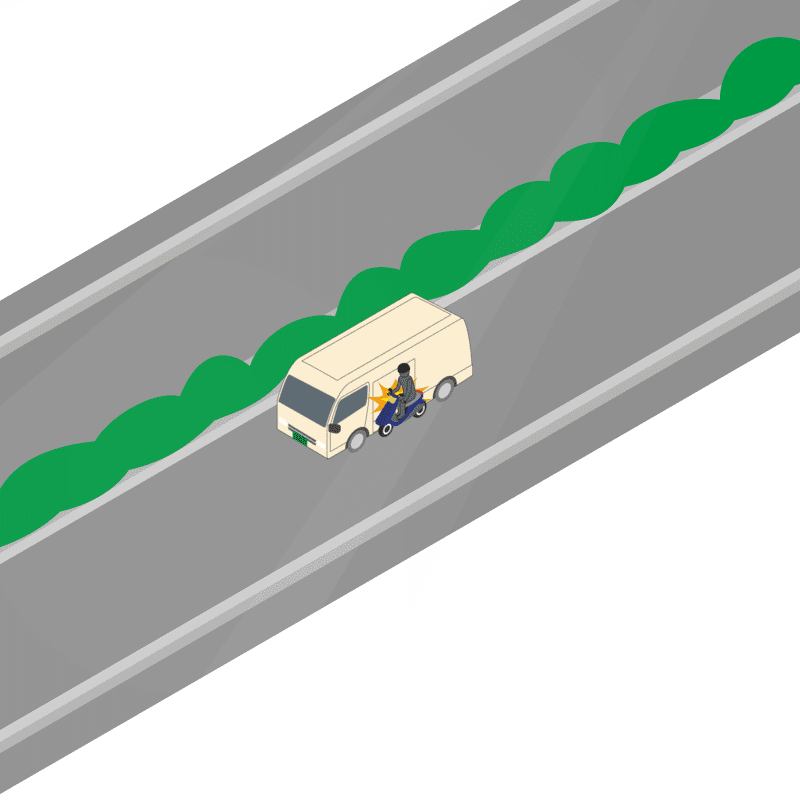 ・イラストに使用している各要素(車、背景、車、天候、信号、衝突地点など)は、代表的なイメージをイラスト化しており、色や形状等含め現実の事故の状況とは異なります。あくまで、事故のイメージとして参考までにご活用ください。