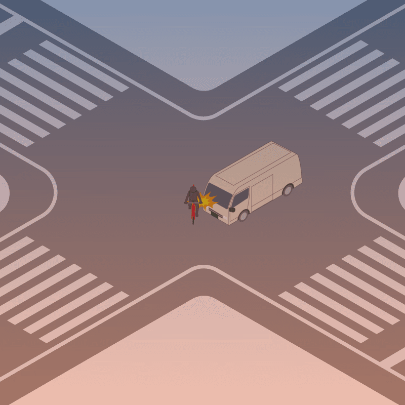 ・イラストに使用している各要素(車、背景、車、天候、信号、衝突地点など)は、代表的なイメージをイラスト化しており、色や形状等含め現実の事故の状況とは異なります。あくまで、事故のイメージとして参考までにご活用ください。