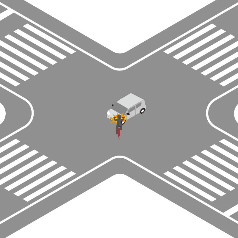 ・イラストに使用している各要素(車、背景、車、天候、信号、衝突地点など)は、代表的なイメージをイラスト化しており、色や形状等含め現実の事故の状況とは異なります。あくまで、事故のイメージとして参考までにご活用ください。